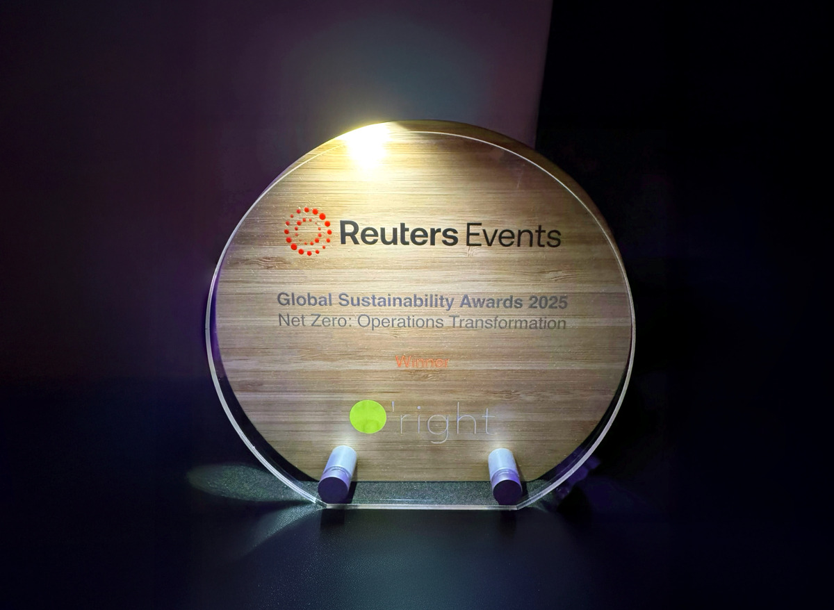 O'right's Net Zero Transformation Award trophy from the Reuters Global Sustainability Awards 2025, recognizing the company's exceptional leadership in evidence-based sustainability governance and scalable decarbonization innovation.