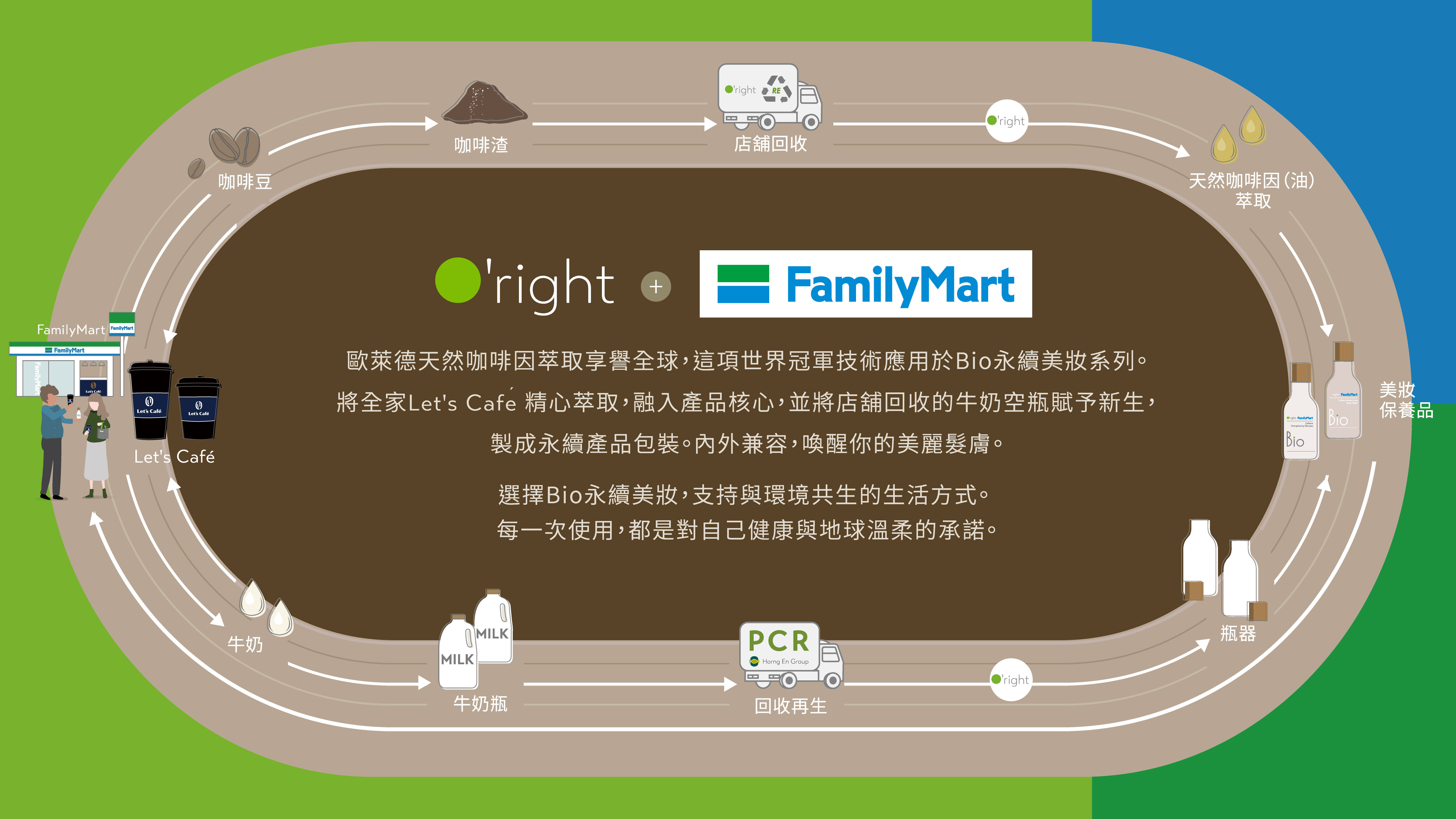 歐萊德攜手全家便利商店,於便利商店場域中以全球首創「社會參與循環設計機制」,將門市Let’s Café日常營運中產生的咖啡渣與牛奶瓶,透過綠色供應鏈再生為永續美妝產品,提供給曾經為這份資源做出貢獻的消費者,以全新面貌重新回到門市上架。此設計翻轉傳統線性「買了就丟」的消費邏輯,重新定義消費者為 「資源貢獻者」與「循環參與者」,建構出可規模化、可複製的綠色循環經濟模式。