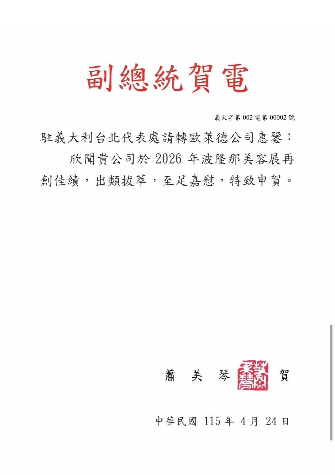 在全球最大的 Cosmoprof Worldwide Bologna 國際美業展會現場,台灣品牌歐萊德(O’right)自全球773件創新技術中脫穎而出,榮獲 COSMOPACK Awards 2026「Innovation Technology」全球首獎。消息傳回台灣,中華民國總統與副總統相繼致函,以官方賀電表達對歐萊德的肯定與鼓勵。